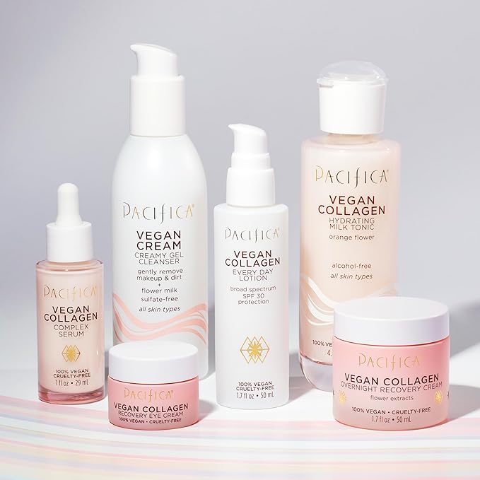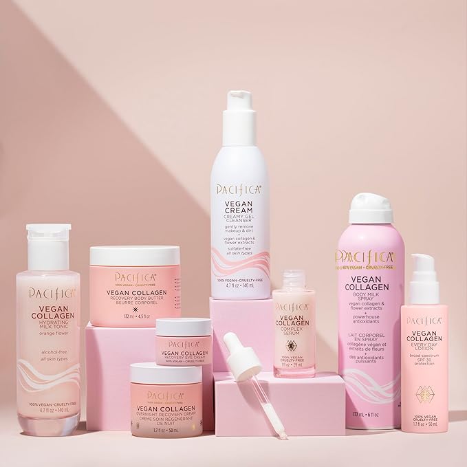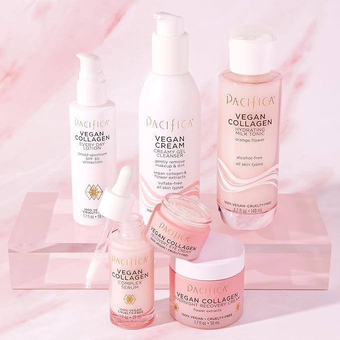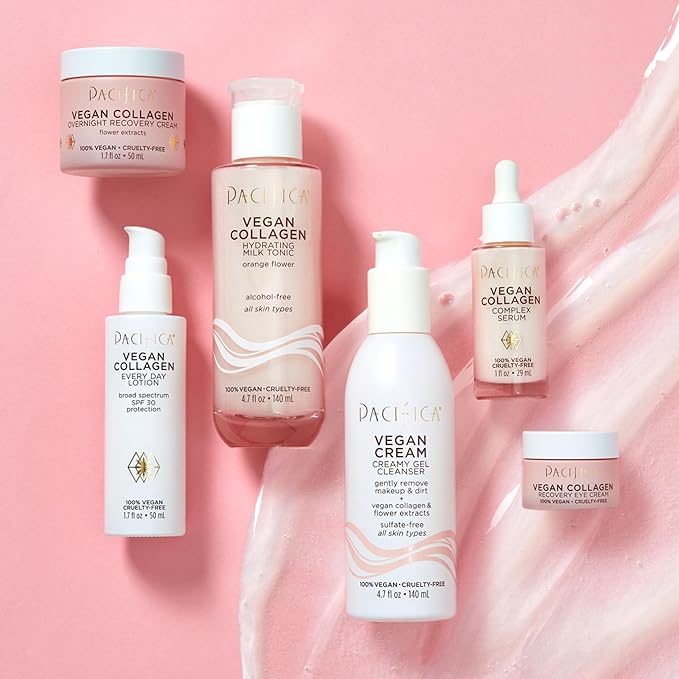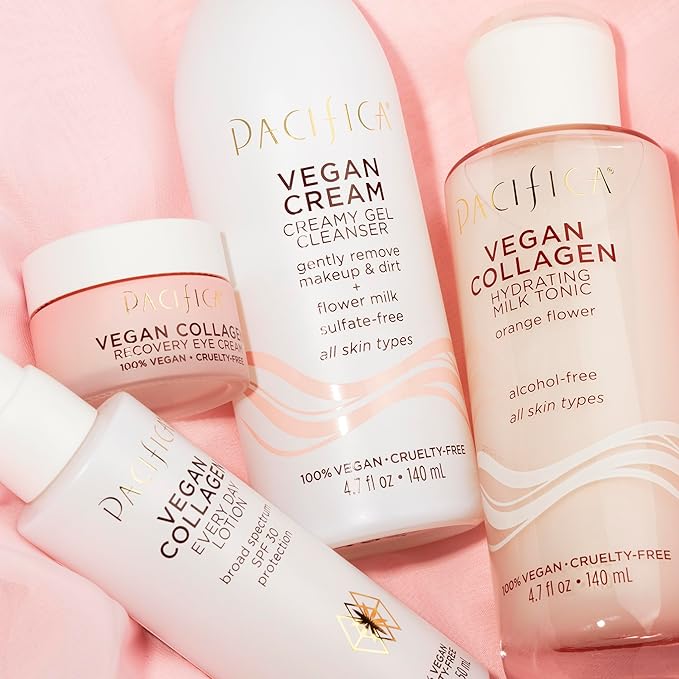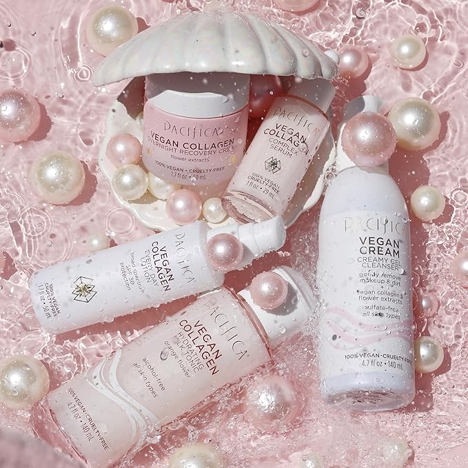 - Hydrating Vegan Collagen Cleanser – Gently washes away makeup, oil, and impurities while replenishing moisture. Enriched with vegan collagen to help boost elasticity and anti-aging benefits, this foaming facial cleanser promotes a plump, youthful-looking complexion with every wash.