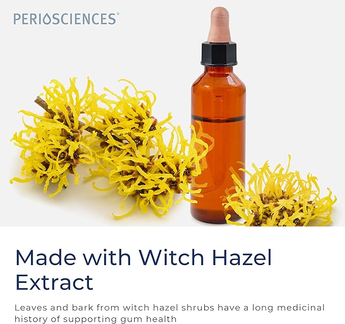 - Natural ingredients - PerioSciences mouthwash for sensitive teeth is made using our signature antioxidants and essential oils such as phloretin, ferulic acid, menthol peppermint oil, and plasdone. The Sensitive rinse contains witch hazel extract known to support gum health.
