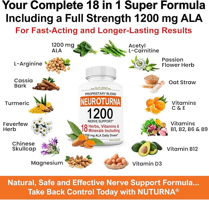 - ✅ YOU GET 5 FANTASTIC BENEFITS in ONE EASY to TAKE CAPSULE… (1) Contains All 10 Science-Backed Vitamins, Minerals and Herbs in the necessary dose YOU need (2) Includes a Maximum Strength 1200 mg ALA Alpha Lipoic Acid Daily Dose (3) The Unique NUTURNA Proprietary Blend of Natural Ingredients (4) Pharmacist Formulated with 18 Premium Ingredients...