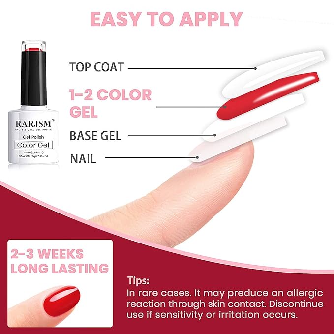 - EASY TO APPLY LONG LASTING:The classical good tenacity gel nail polish is long-lasting for 21+days cover by glossy or matte top coat with proper application.Matching with gel base and top will keep longer.Nail lamp required for this gel nail polish because it can't dry by air.We highly recommend 60 seconds curved with LED lamp