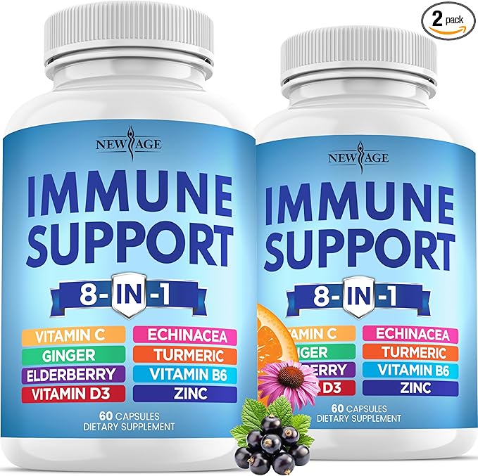 NEW AGE 8 in 1 Immune Support Booster Supplement with Echinacea, Vitamin C and Zinc 50mg, Vitamin D 5000 IU, Turmeric Curcumin & Ginger, B6, Elderberry 120 Count (Pack of 2)