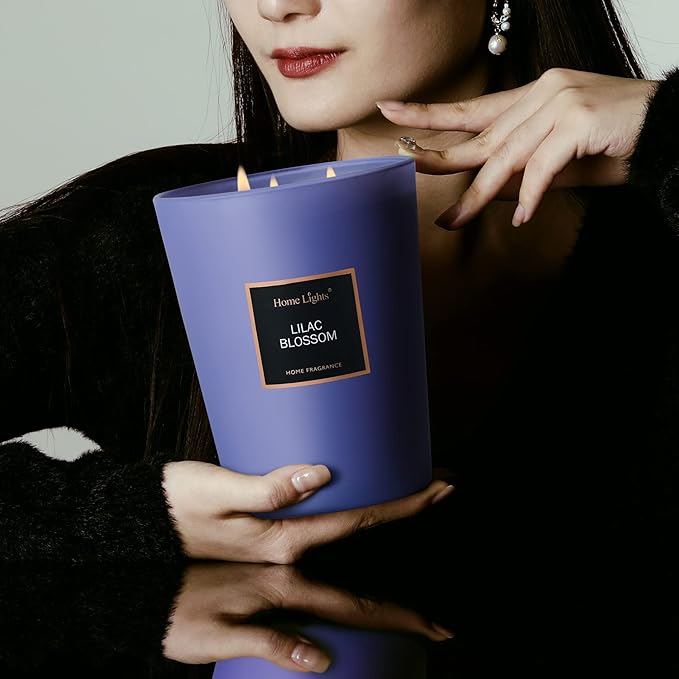 HomeLights Highly Scented Soy Candles Big 33.3 oz for Home. 3 Cotton Wicks, Smokeless Long Lasting 130 hrs in Lilac Blossom. 5x6, Great Gift for Women & Men