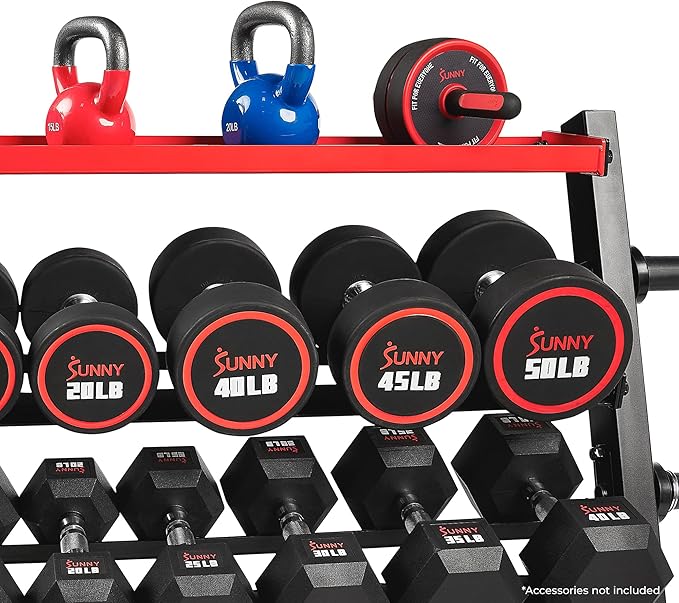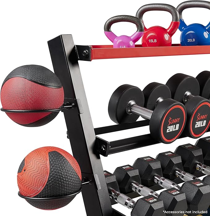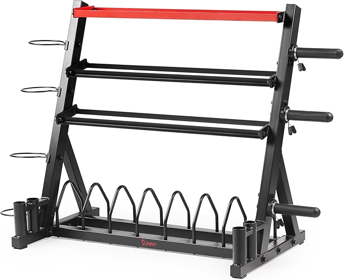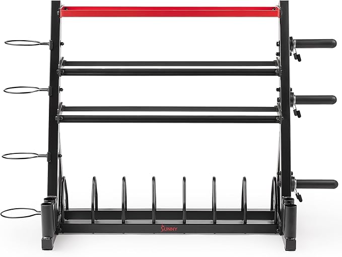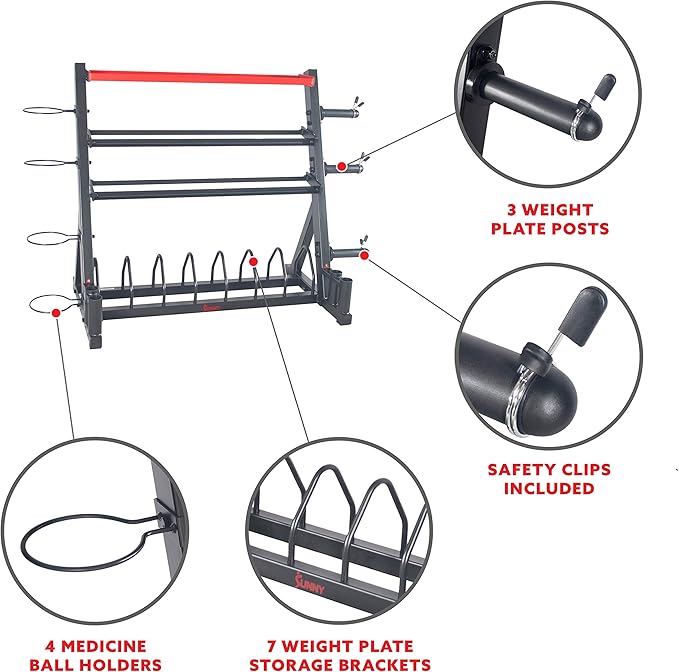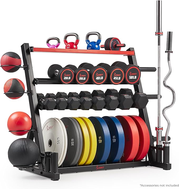 Sunny Health & Fitness Multi-Weight Storage Rack Stand for Dumbbells, Kettlebells, Olympic Weight Plates, Barbell, Medicine Ball
