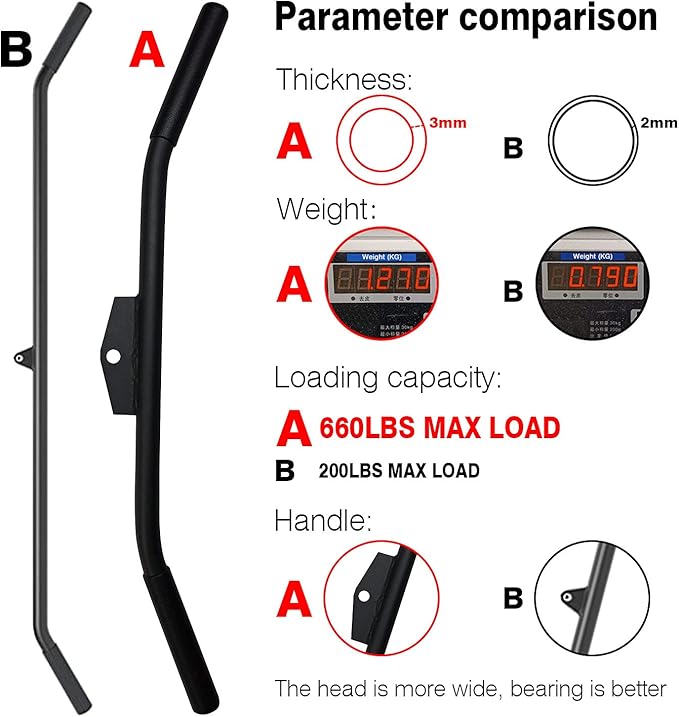 - Good Material: Use good quality solid steel to make the LAT bar. The thickness of this pull down bar is 3mm. And others is about 1.5mm or 2mm. Not strong as our fitness bars. This handgrip of the LAT pulldown bar is made of dipped PVC, will not fall off due to sweat in Summer, since the surface is matte which can anti-skid.