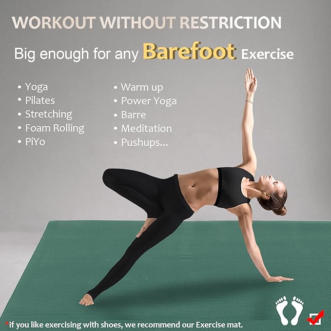- 【WORKOUT WITHOUT RESTRICTION】Extra long & wide for all-purpose fitness WITHOUT Shoes. Ideal for home yoga studios. Never feel restricted or limited by the size of your spacious gym mat. It can be used for any yoga pose, pilates, meditation, stretching, light cardio or other workout routines. Works great on most floor surfaces.