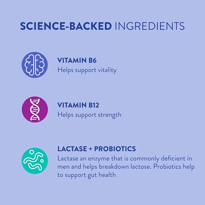 - Digestive Enzymes for Men: Our Men’s Daily is rich in digestive enzymes and probiotics to support men’s gut health. Designed exclusively for men, Men’s Daily, is formulated with digestive enzymes such as Amylase, Lactase, Lipase, and probiotics to reduce bloating, gas, and abdominal discomfort. We’ve also added Vitamins B6 and B12 to promote strength and vitality.