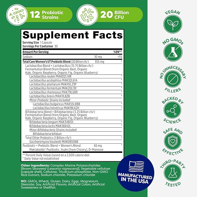 - Women's UT Support: Uniquely designed to support women's urinary tract and vaginal health; Daily use can also help support digestive and immune health; Contains probiotics from fermented kale, blueberries, beets, figs and raspberries