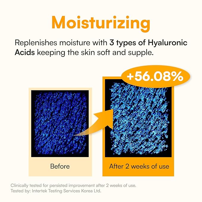 - Moisturizing : Replenishes moisture with 3 types of Hyaluronic Acids keeping the skin soft and supple.