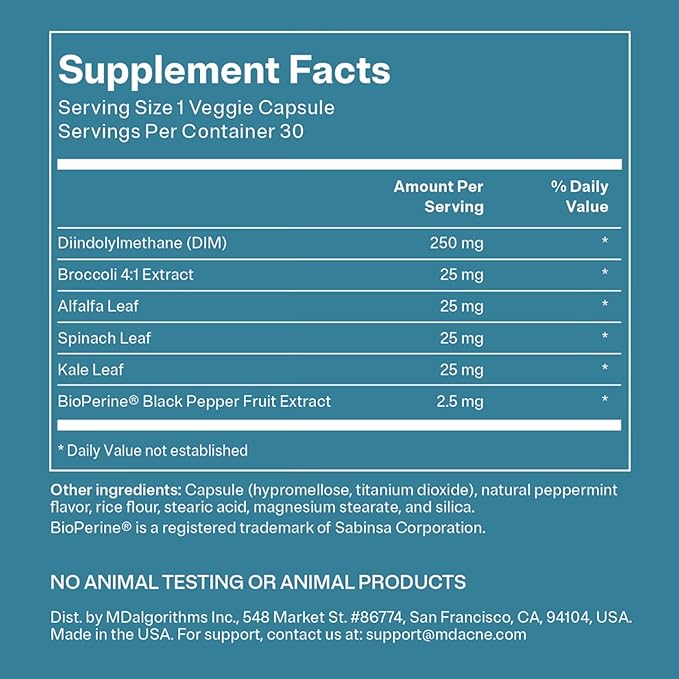 MDacne DIM Skin Clearing Supplements (30 Vegan Capsules) - for Acne Treatment, Estrogen Balance, Hormone Menopause Relief & Bodybuilding, Cruciferous Extract & Bioperine (30 Count (Pack of 1))