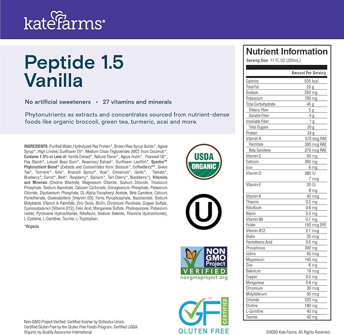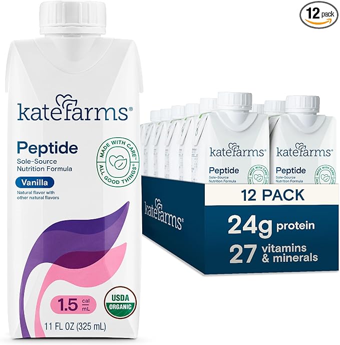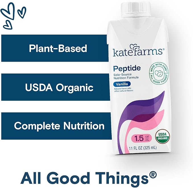KATE FARMS Organic Adult Peptide 1.5 Formula, Vanilla, Sole-Source, Hydrolyzed Plant-Based Nutrition for Oral or Tube Feeding, 11 Fl oz (12 Pack)