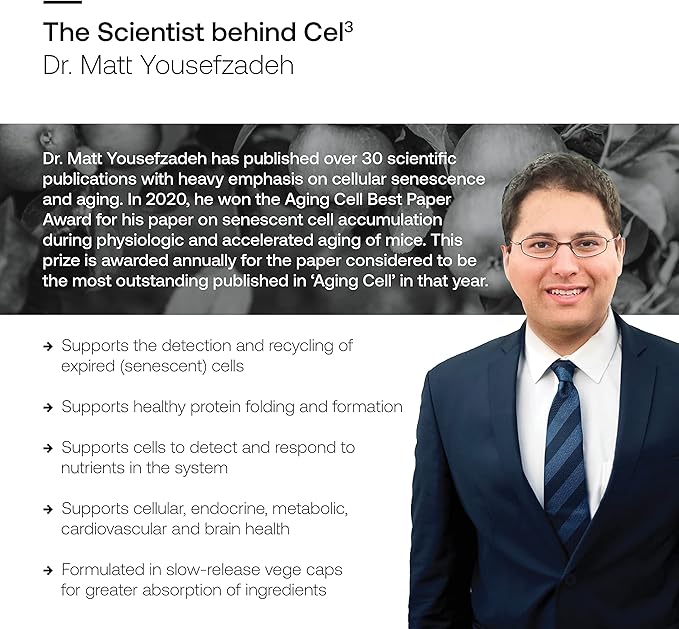 - SCIENTIST-FORMULATED: Cel³ was formulated by Dr Matthew Yousefzadeh, who has published over 40 scientific publications with a heavy emphasis on cellular senescence and aging. Dr Yousefzadeh has led numerous projects researching the efficacy of Fisetin and how it supports healthspan and lifespan.