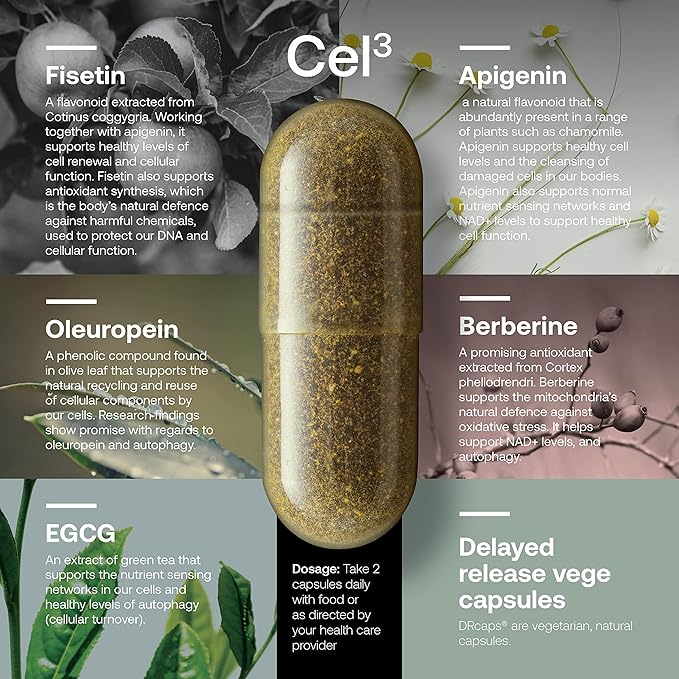 - UNIQUE BLEND: Cel³ contains ingredients from the forefront of scientific research, including Apigenin, Fisetin, Oleuropein, Berberine, and EGCG. All of these ingredients support autophagy and healthy cell turnover.