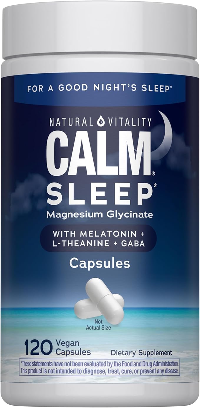 - DIETARY SUPPLEMENT: One bottle of 120 Natural Vitality CALM Sleep Magnesium Supplement Capsules includes essential melatonin that helps you to relax so you can ease into a restful, evening sleep (1)