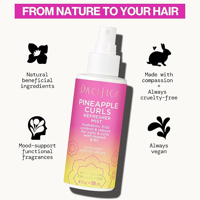 Pacifica Pineapple Curls Refresher Mist - Curl Refresher Spray, with Hyaluronic Acid, Vitamin B5 and Plant Oils, Vegan and Dermatologist Tested Curly Hair Products and Wavy Hair Products - 4 Fl Oz