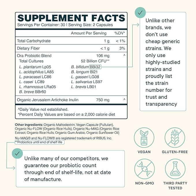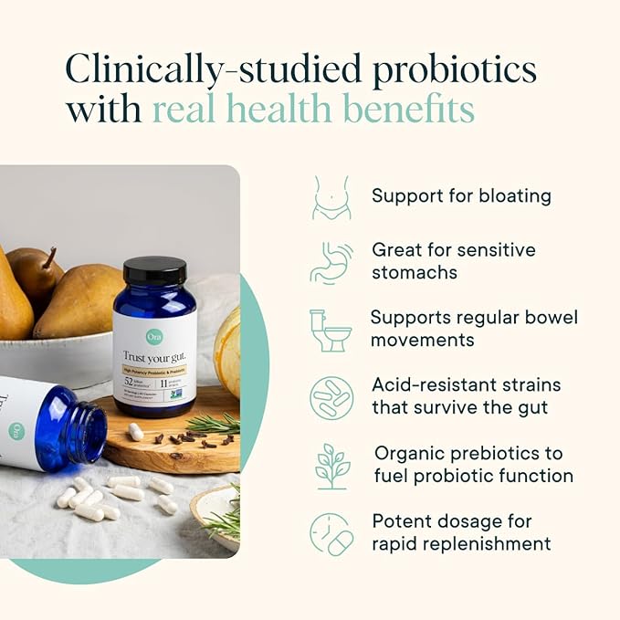 Ora Organic Probiotics with Prebiotics - 52 Billion CFU 11 Clinically Studied Strains for Digestive Health, Trust Your Gut, Gluten Free, 60 Capsules