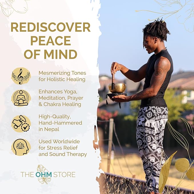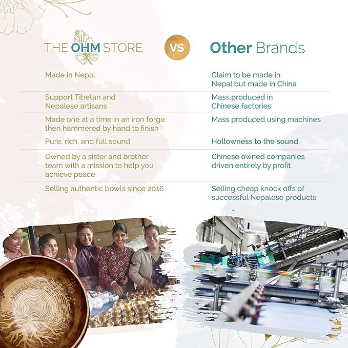 - HAND-INSPECTED AND TESTED FOR PERFECT SOUND QUALITY — The Ohm Store ensures it produces and sells only the highest quality and best playing Tibetan singing bowl sets by hand inspecting and testing each set for perfect sound quality. Our products are built to last, offering reliable use over time. Due to the handmade nature of our singing bowls, the size and shape of each one will vary slightly. There will never be another exactly like yours. The spirit of the artist is shown in the unique, one-of-a-kind detail.