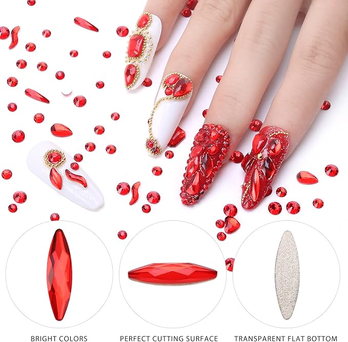 Nibiru 3830Pcs Red Multi Shapes Rhinestones Glass Diamonds Kit for Nail Art Jewels Decoration, Shiny Flatback Mix Size with Wax Pen