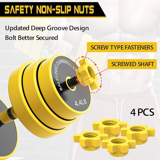 - Durable Weight Training Equipment - Crafted from premium materials for long-lasting use, our weight plates are constructed with robust cast iron and coated with a rust-resistant black paint finish. The added yellow TPU protective cover on the weight plates not only shields floors and equipment from scratches but also adds to their longevity. Plus, our upgraded nut design ensures that your dumbbells or barbells stay securely in place during your weight training sessions with no loosening worries.