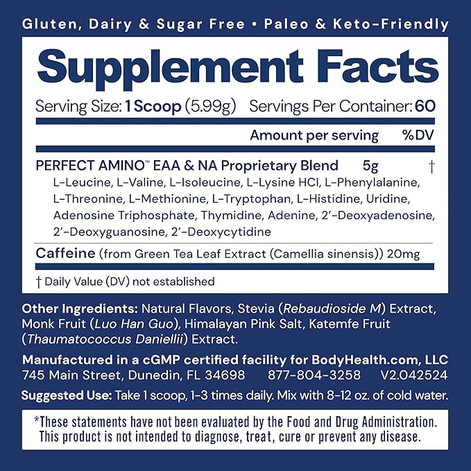 BodyHealth PerfectAmino Powder - BCAA and EAA Powder for Pre and Post Workout - Amino Acid Energy Drink for Men and Women to Support Lean Muscle and Recovery - Mocha - 60 Servings