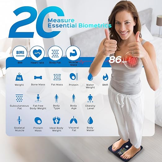 - FSA & HSA Eligible – 20-Point Smart Body Composition Scale: Track your health goals with our advanced body weight scale. Using Bio-electrical Impedance Analysis (BIA), it measures 20 essential body metrics including weight, body fat percentage, BMI, muscle mass, heart rate, water weight, bone mass, BMR, and more. Perfect for weight loss, fitness, and overall health management.