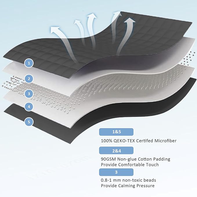 - Premuim Material: The weighted blanket is made of soft breathable microfiber material and filled with 0.8-1 mm non-toxic hypo-allergenic glass beads. This blanket could providing a cooling sensation in the summer and a breathable warmth in the winter