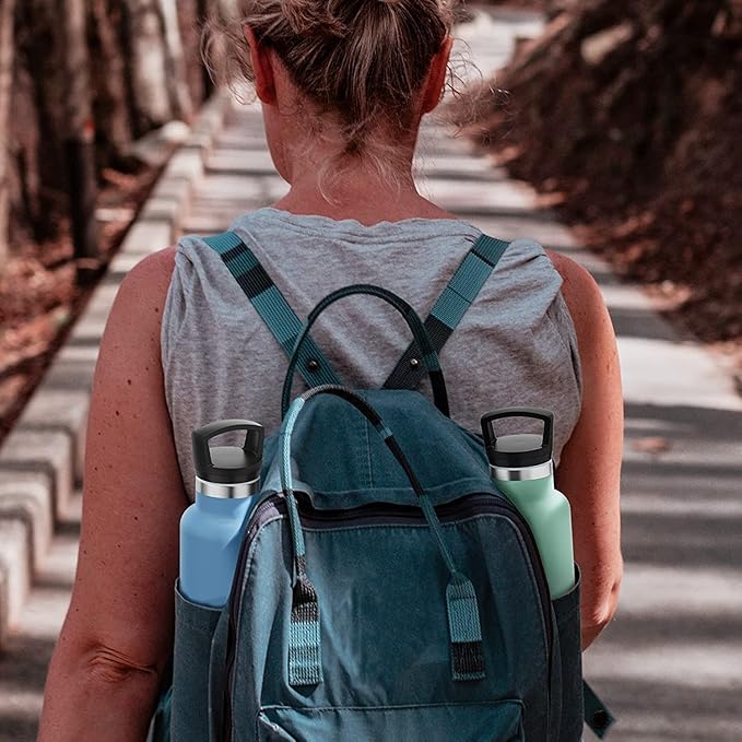 - THOUGHTFUL LID DESIGN (BPA free): Our stainless steel water bottle with straw is equipped with 2 lids: 1 flip-up straw lid and 1 portable handle lid. The handle lid comes with a filter, so you don't have to worry about ice cubes slipping into your mouth