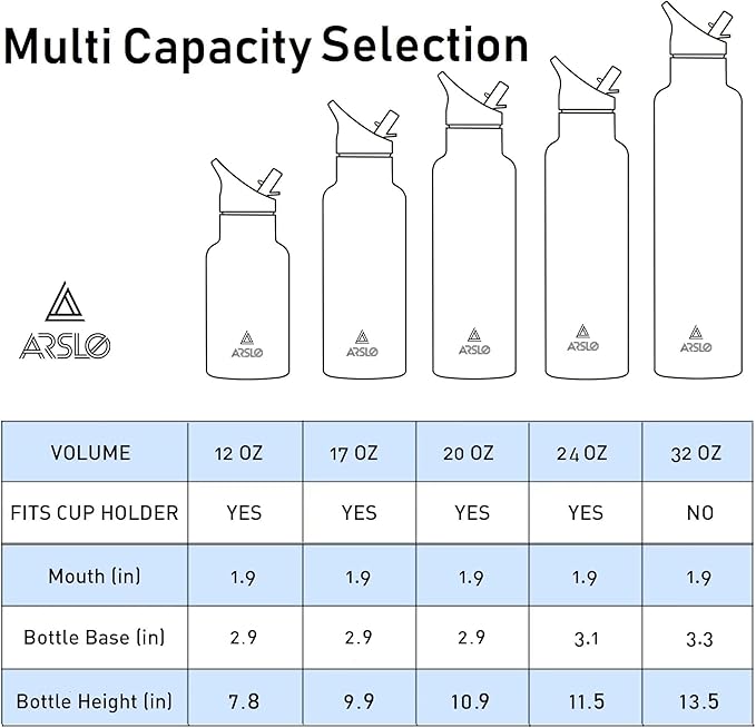 - INSULATED WATER BOTTLE: Arslo 17 oz water bottle features advanced vacuum double-wall insulation technology that keeps your beverages hot for 12 hours and cold for up to 24 hours, even the last sip of a cold drink or hot coffee