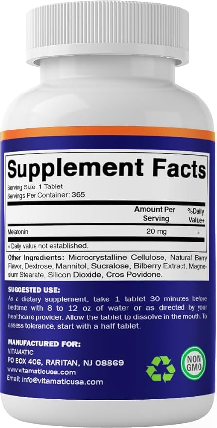 Vitamatic Melatonin 20 mg Tablets | Vegetarian, Non-GMO, Gluten Free | 1 Year Supply | Natural Berry Flavor - 365 Tablets