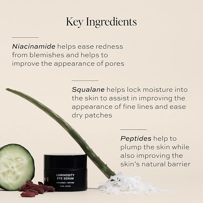 - UNDER EYE CREAM: Ditch the appearance of dark circles and under-eye bags with our Luminosity Eye Serum! This powerful cooling serum is packed with Super Star Ingredients like goji berry, grape seed extract, cucumber extract, and peptides. Notice a difference with our Luminosity Eye Serum.