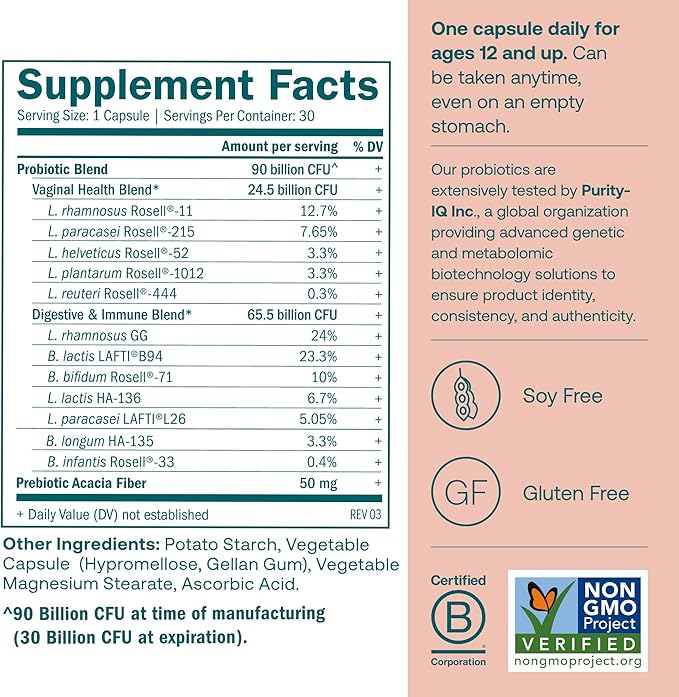 - RESTORE BALANCE - This blend of 12 DNA-verified probiotic cultures helps support digestion, immune health & a healthy balance of bacteria in the vaginal microbiome. Also includes a plant-based Acacia prebiotic fiber, known to be gentle on the stomach.