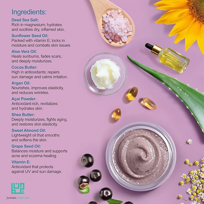 Juman Dead Sea Salt Body Scrub | Infused with Aloe Vera Essential Oil & Cocoa Butter | Acia Berry Scrub | Removes Dead Skin Cells and Rejuvenate Dull Skin | SlS & Paraben Free | Vegan | 11.46 Oz