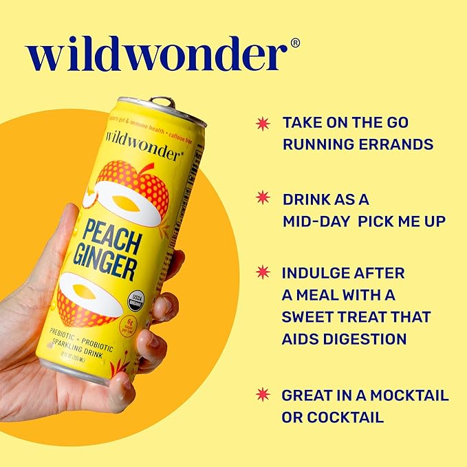 wildwonder Sparkling Probiotic Drink 12pk, For Gut Health & Immune Support, Peach Ginger, 5g Prebiotic Fiber, Live Probiotics, Organic, Vegan, Low Sugar, 12 Pack, 12oz Can, As Seen on Shark Tank