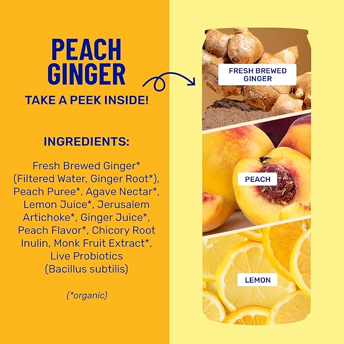 - PEACH GINGER: Take care of your gut health with our Peach Ginger flavor. Made up of peruvian ginger juice, succulent peach, and fresh brewed ginger root, an irresistible gut-healing twist on a sweet peach tea. A sparkling drink with peachy vibes that leave a zesty kick.