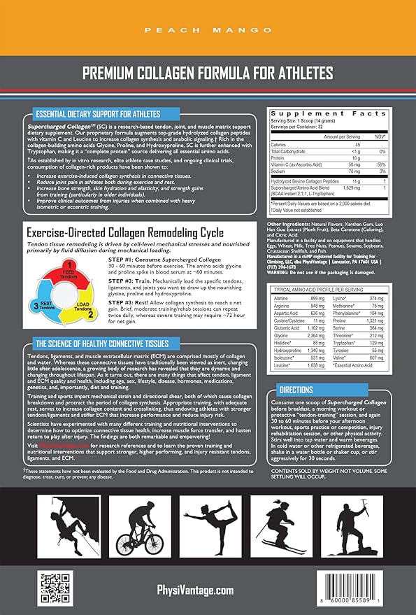 PhysiVantage Supercharged Collagen Peptides Powder - Hydrolyzed Collagen for Joint, Tendon, Ligament, & Skin Health Support - Peach Mango, Keto, Paleo, 16oz | Enhanced with Vitamin C, BCAAs, Grass-Fed