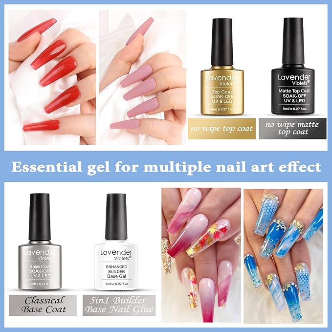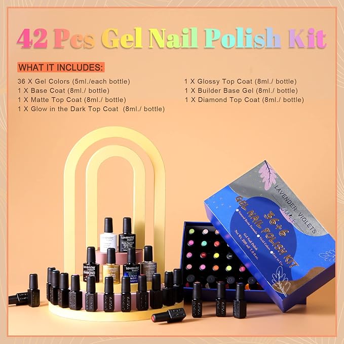 Lavender Violets 42 Pcs Gel Nail Polish Set, 36 Colors with 6 Bottles of Base Top Coat, Glossy Matte Diamond Shine Glow in the Dark Top Coat for Nail Art C950