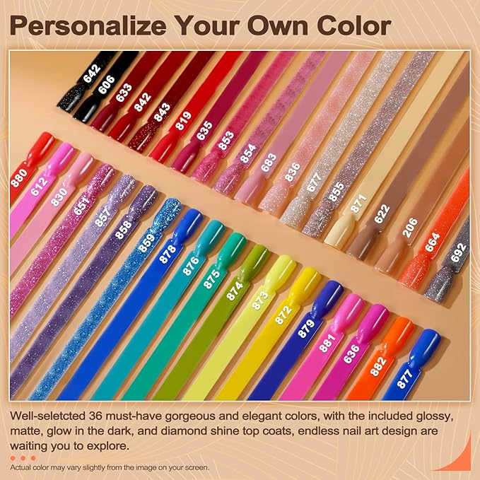 - Vivid 36 Colors: Gel colors are highly pigmented, suitable for all skin tones and you can go for it without any hesitation. This perfect nail shade matches well with all your outfits optimally. Enjoy gorgeous nail art anytime and anywhere.