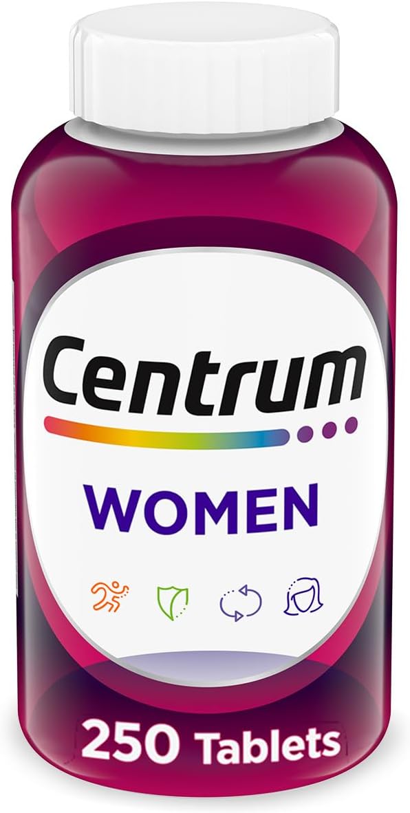 - 250 count bottle of Centrum Multivitamin for Women, Multivitamin/Multimineral Supplement with Iron, Vitamin D3, B Vitamins and Antioxidant Vitamins C and E