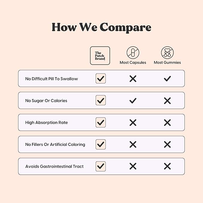 - SUPERIOR ABSORPTION: Vitamin capsules, tablets, and pills have poor absorption properties, allowing only 10% of the effects of the active ingredients. Our innovative patch allows for much higher absorption rates and a steady release of the active ingredientsâgiving you up to 24 hours of continuous benefit.