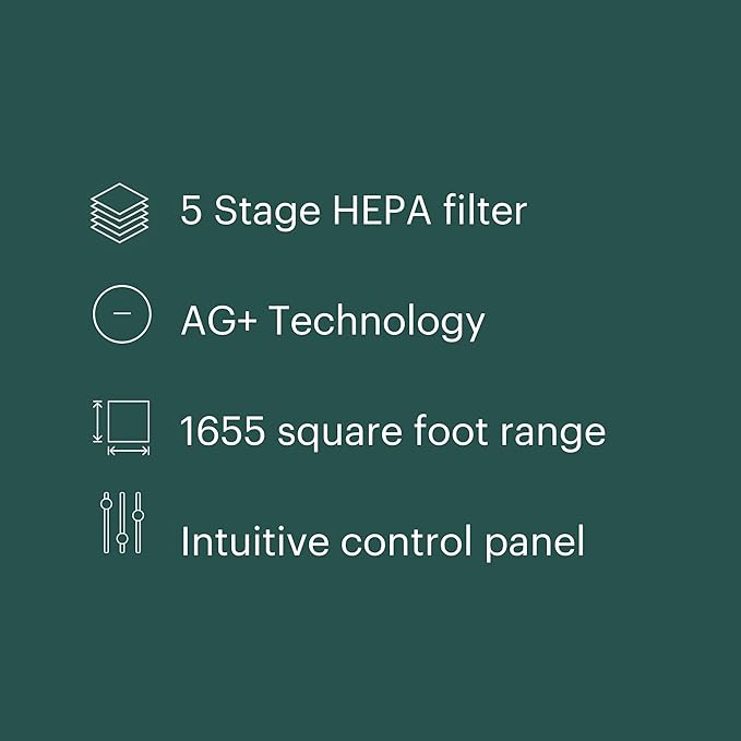 - Comprehensive 5-Stage Filtration System – Equipped with a pre-filter, H13 HEPA filter, activated carbon filter, UV technology, and plasma purification, this air purifier effectively captures airborne particles as small as 0.3 microns, including dust, pollen, smoke, and pet dander, ensuring cleaner air in your home across 1,655 square feet