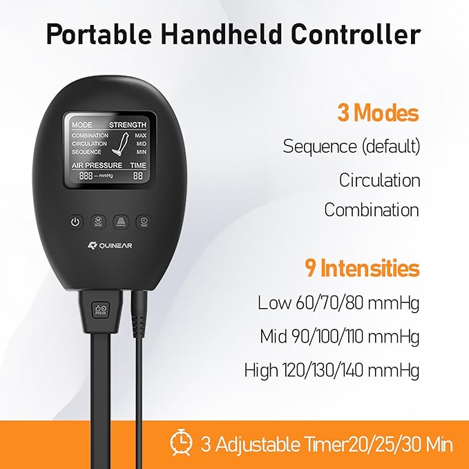 - UPGRADE DIGITAL DISPLAY CONTROLLER: LED digital display handheld controller let you can clearly know the current massage location and the leg pressure. QUINEAR comes equipped with two zones (foot, calf) that are able to be filled in 3 patterns (sequence, circulation and combination) and filled to 3 different pressure settings. The pressure settings on the device ranges from 0-150mmHG (Level 1: MIN-60 mmHg; Level 2: MID-90 mmHg; Level 3: MAX-140 mmHg).
