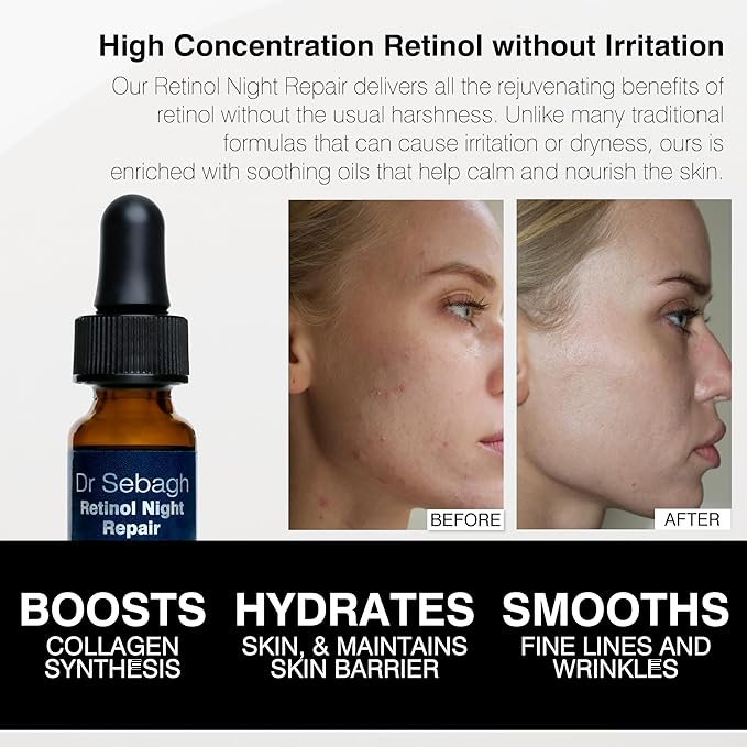 Dr Sebagh Retinol Night Repair (1 fl oz) - High-Strength Retinol Serum for Face - Skin Booster Serum with Vitamin E, Rosehip Oil & Squalane - Boosts Collagen & Brightens Skin