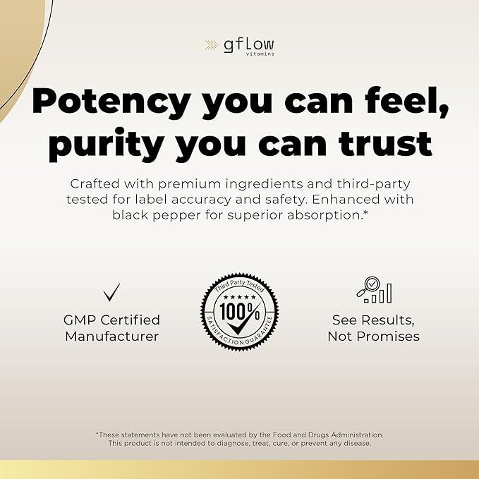 - SAFE STANDARD QUALITY: Manufactured in the USA in facilities that follow strict Good Manufacturing Practices (GMP), Gflow supplements are tested for purity and potency. Every bottle reflects our commitment to excellence, safety, and consistency. When you choose Gflow Ashwagandha, you’re choosing a brand dedicated to transparency, integrity, and delivering premium supplements at an affordable price. Your wellness journey deserves nothing less.