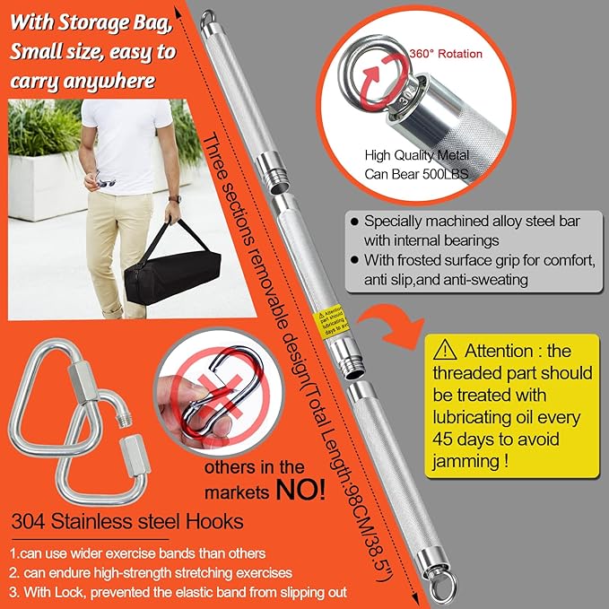 - ๐จ [500LBS Heavy-Duty Bar & Secure Rotation] Precision-machined alloy steel bar with internal bearings supports up to 500LBS. 3.2 feet length with 360ยฐ rotating ends and anti-slip frosted grip ensures safety during intense workouts. Heavy-duty triangle hooks fit bands โค2.52" wide for versatile compatibility.