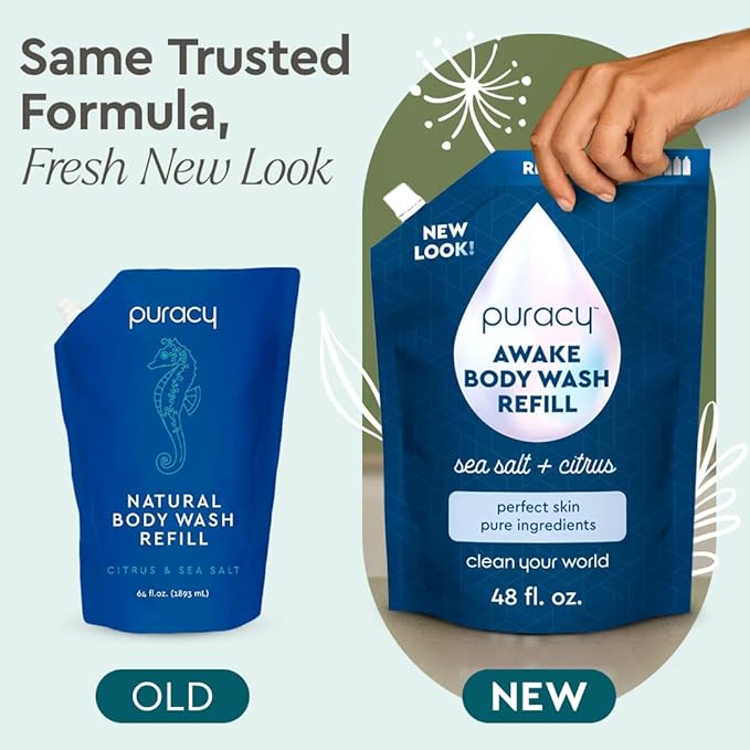Puracy Body Wash Refill, Natural Body Wash, 98.6% Pure Plant Ingredients, Moisturizing Shower Gel for Women Men Kids, Body Soap for Dry Sensitive Skin Gently Scented with Citrus & Sea Salt, 48 Oz