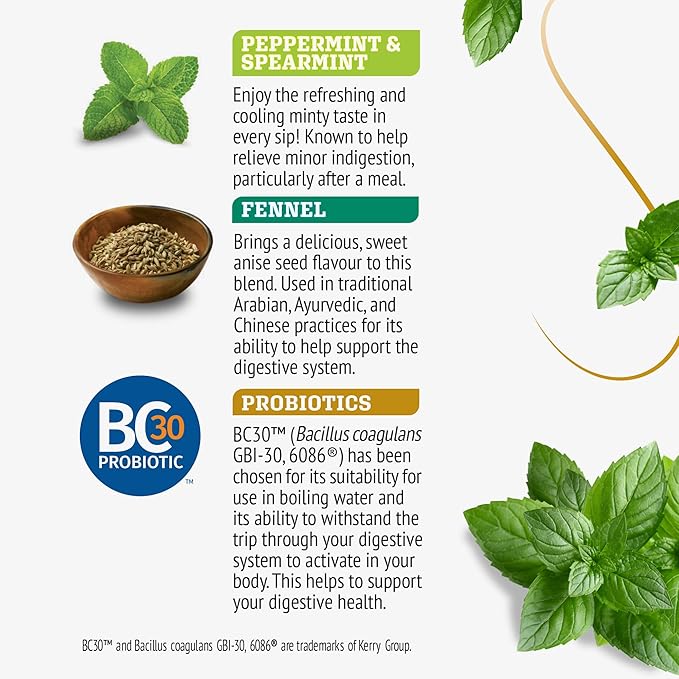 - TUMMY-FRIENDLY PROBIOTIC TEA: Peppermint and Spearmint provide cooling minty taste while fennel brings a sweet anise seed flavour with BC30 Probiotic, all known for their digestive support