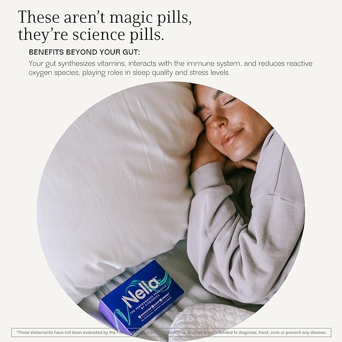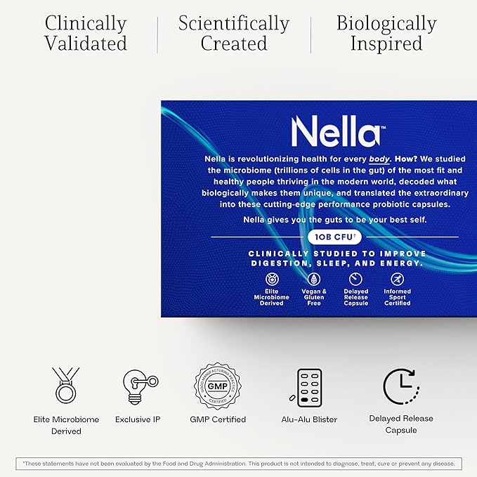 - Daily slow release capsule: Take Nella by Fitbiomics daily to enjoy the benefits of improved gut health and the unique functionality of Nella’s proprietary strains that have been shown to affect immune system, nightly rest, and holistic health