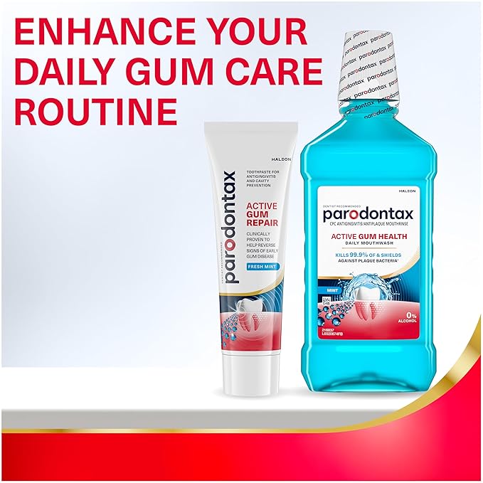 - Three 16.9 fl oz bottle of Parodontax Active Gum Health Mouthwash, Antiplaque and Antigingivitis Mouthwash, Mint