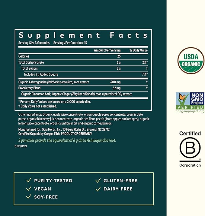 Gaia Herbs Organic Ashwagandha Gummies, Stress Support, Cinnamon, Ginger, Gluten Free, Vegan, 45 Count