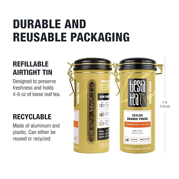 - REUSABLE TEA TIN FOR TEA LOVERS: Our charming and reusable tin is the perfect gift for tea enthusiasts. Offering airtight storage, it ensures that your ceylon black loose leaf tea remains cozy and fresh for 40-50 cups. Not only a functional addition to your tea collection, but it also sits beautifully on your countertop, a testament to your passion for fine teas.