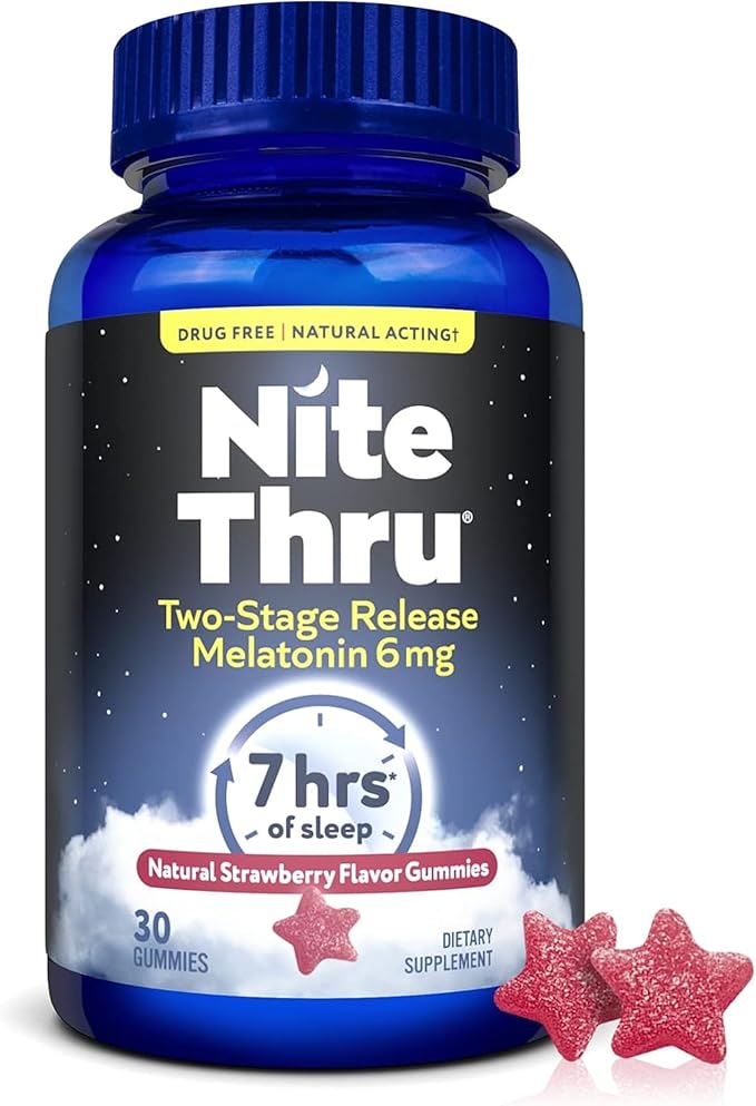 - TWO-STAGE RELEASE MELATONIN GUMMIES: Now you can get the same NiteThru melatonin sleep aid benefits in a vegan gummy with natural strawberry flavor—formulated with 6mg of non-habit-forming melatonin.